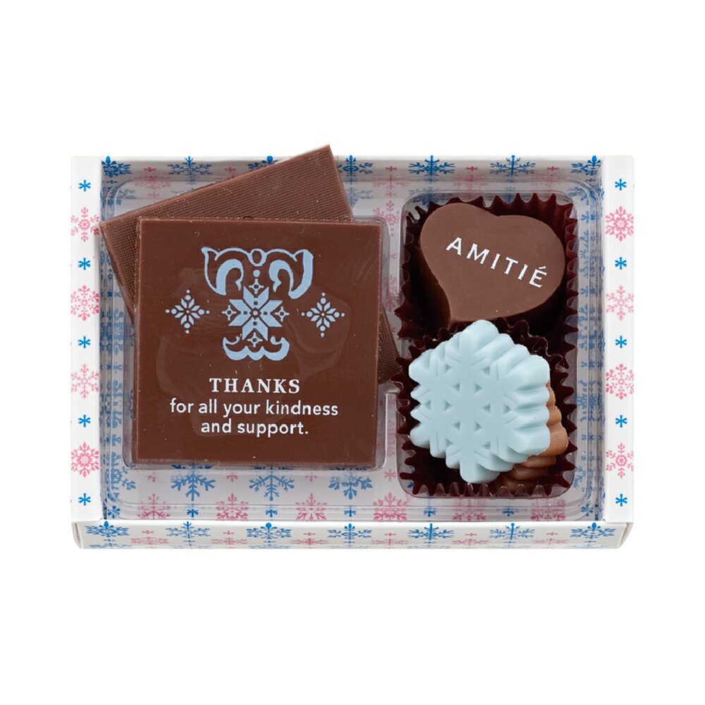 心からの感謝をそっと伝える優しいブルーのボックスには、雪の結晶型のライトブルーのチョコレートを詰めました。