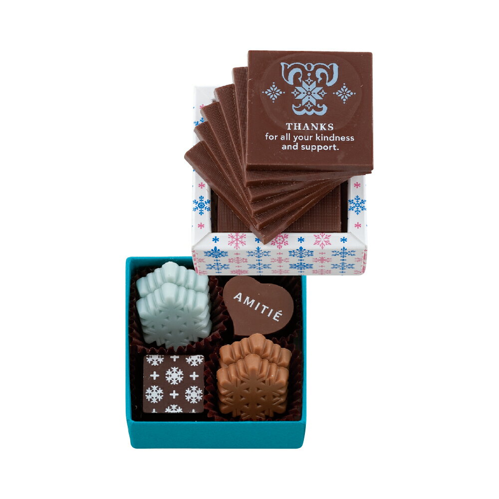 サンクスブルーは、心からの感謝をそっと伝える優しいブルーのボックスには、雪の結晶型のライトブルーのチョコレートを詰めました。